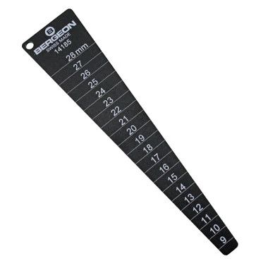 This handy lug gauge features a tapered design that allows you to gauge the space between case ends when selecting a watch band or spring bar. It will give you the exact measurement needed to determine the distance between watch lugs for spring bars, bands or bracelets. This is an important addition to any watchmakers bench. The metal gauge reads both inches and millimeters.