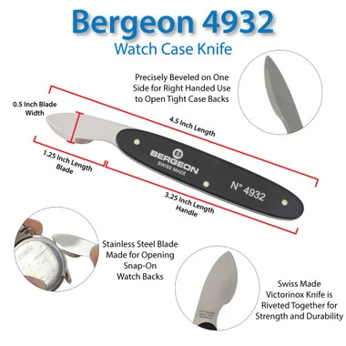 Cheap and dull case knives can easily slip or break during use, causing scratches or other damage to the watch. When you are working on high quality watches you need high quality tools and no one makes finer tools than Bergeon. Bergeon’s Swiss quality is built into this professional watchmakers case knife. Its precisely beveled blade is made by the famous “Swiss Army®” knife manufacturer, Victorinox. The high quality blade allows it to be sharp enough to pop open the tightest watch case backs and strong enough not to distort or break. The weight of this case knife is ideal and gives it a superb feel and balance in your hand. Blade is constructed of stainless steel and is available only in right-handed. Overall length is 4.5″ inches (115mm).