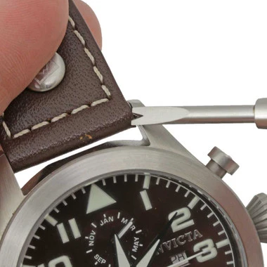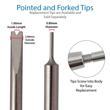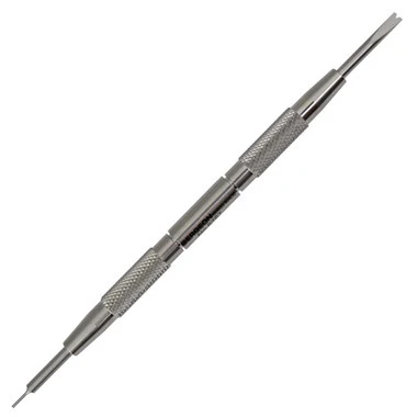 You can feel the quality built into this solid spring bar tool. Features stainless steel construction that feels sturdy in your hand. This fine quality steel spring bar tool with replaceable tips is designed to last a lifetime. It is the perfect tool for removing spring bars from metal and leather watch bands. The forked end works great for opening spring bars, and the pointed end is just right for compressing shouldered spring bars from the lug holes. The weight, handle knurls, and size make this watch tool ideal for the delicate job of adjusting the size of watch bands or repairing a watch clasp. Each tip is removable and has identical threading making it easy and convenient to change or replace the tips as necessary for repair work.