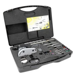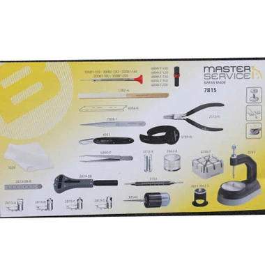 A master tool set from Bergeon comes ready for your next repair with 46 tools and replacement tips in a hard plastic carrying case. Contains some of Bergeon’s most popular Swiss made watch repair tools. The kit includes: multi-use bracelet press, JAXA case opener with 4 different style pins, an eye loupe, 5 screwdrivers (1.00-2.00mm) with spare blades, a leather buff with protector sleeve, spring bar tool with spare points, microfiber cloth, plastic tweezer, non-magnetic stainless tweezer, small ruler, wrist measuring band, case opening knife, watch band holding block, flat nose pliers, 6 plastic boxes, and air blower. All these tools make changing batteries, adjusting bracelets and other repairs easy!