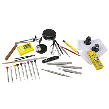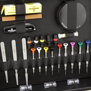 Bergeon’s latest watch service tool kit features an incredible selection of 43 tools specially chosen for after sales watch adjustment, cleaning, and service. Supplied in a deluxe leatherette case which securely holds each component. The kit includes these fine quality Bergeon tools: