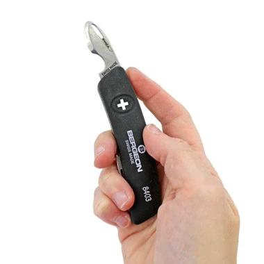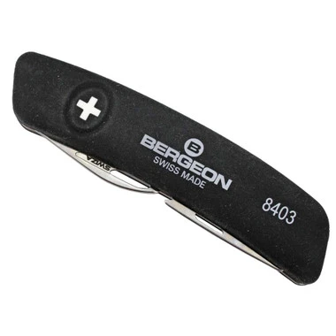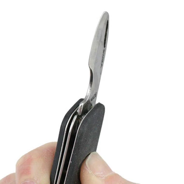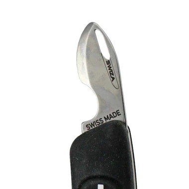This case knife features a black non-slip handle and a blade safety lock. Stainless steel case knife opening blade and a forked spring bar tool. Press the SWIZA cross to unlock the blade and close the tool.