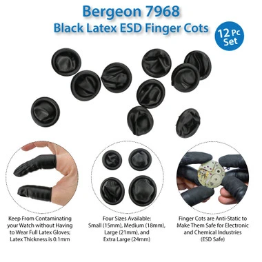 These Black Latex finger cots, cover just your fingers to make it possible for you to get all the benefit of Latex gloves without having to wear the whole glove. The Latex finger cots prevent you from contaminating your watch movement with finger oils and grime. It also keeps your fingers clean when doing messier work, like using glue. These finger cots are made without the powder found in most latex products and are anti-static, making them ESD safe for watchmaking, electronic and chemical industries