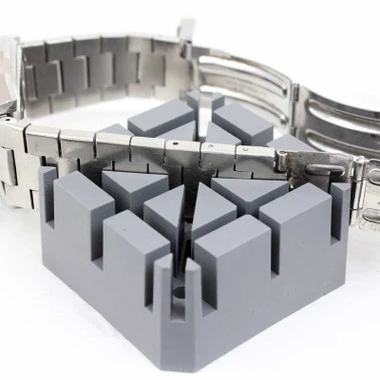 This classic Bergeon bracelet ‘support’ will accommodate bands in a variety of thicknesses. It has five slots which range from 2.5mm to 4.5mm. made of synthetic material; overall size is 2″ x 2″ x 1″ inches. This is the holder supplied with these Bergeon bracelet tools: 6744, 6745-100, 7745-100 and 8745.