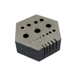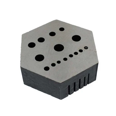 This hexagonal anvil is great for watchmakers and jewelers as it can be used as a base for riveting, drilling, and stacking small parts. Our hex anvil is case hardened and well polished to ensure a long life. Each anvil features 15 holes ranging in size from 3/64″ to 1/4″ (1.2mm to 6.4mm) and five different slots.