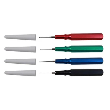 This popular set includes the four oilers most often used in watch repair. The metal handles are hexagon shaped to prevent rolling on the bench and have fine tips for precise lubrication of all movement parts. Oiler is simply dipped into the oil cup or jar and a tiny drop of oil sets on the flat needle, then placed on the desired area of a mechanism. Handle color makes size selection easy – black: extra fine, blue: fine, green: medium and red: large.