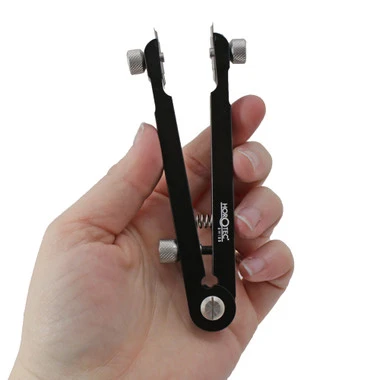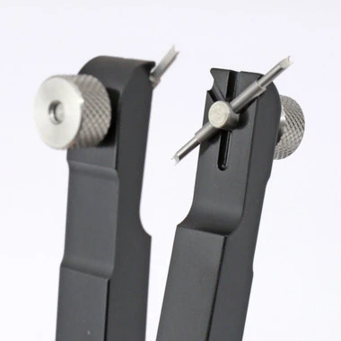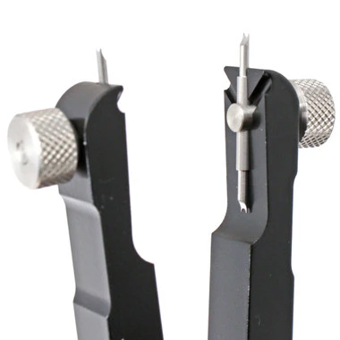 Horotec’s spring bar plier is one of the best available. Used to precisely remove and insert spring bars. It features 2 forked tips which grip and compress the spring bar from both sides and adjusts easily up to 45mm with the knurled set screw. It features a solid aluminum body with hardened steel (hrc 54+/-2) fork tips, which are reversible. Supplied with extra fine tips, just 1.10mm wide and only 0.23mm thick, to fit into tiny spaces between the bracelet and watch case lugs. Replacement fork tips are available in two sizes: 1.10 x 0.23mm and 1.30 x 0.30mm. This very fine quality tool offers these advantages:Â