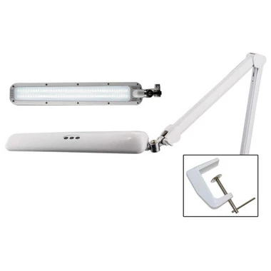 Suitable for workshop or desktop use. 90 LED bulbs emit soft light without ghost, glare, or flicker. The innovative side arm design requires only a slight touch to raise, lower or tilt, directing the lamp source quickly and efficiently onto your work. The lamps are all metal construction and have a universal clamp base for horizontal or vertical mounting. This lamp has an extended arm length for increased lighting range and one touch brightness control.
