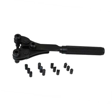 This L-G Master waterproof case opener wrench is made specifically to open all sizes and shapes of waterproof watch cases. It features 3 pin slots and four sets of interchangeable pin types. The L-G patented closing system allows you to unscrew watch case backs without scratching or marring them. Replacement pins and other accessories are available.